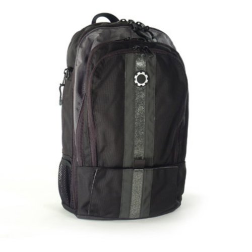 Center Stripe Grey Backpack Diaper Bag from DadGear Constructed with large dual pull zippers this features top-notch materials. Styled in basic black it's fashioned with a stylish grey stripe down the center. The wide clamshell-style opening makes it easy to access the contents of the pack while the diaper hammock keeps diapers close to the top. The subtle styling and modern look will have everyone fooled. A slim changing pad is included. You'll love the hands free design of this backpack allowing you to tend to baby unhindered.