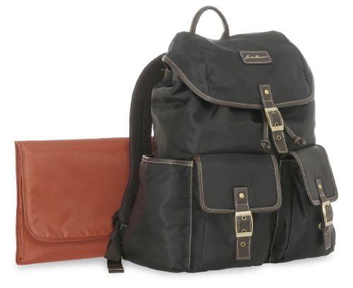Eddie bauer cosmopolitan backpack diaper bag. Top flap opens into spacious main compartment featuring multiple storage areas including insulated bottle holders and zip pocket. Front and side exterior pockets for added storage and organization. Adjustable padded shoulder straps and top carry handle for convenient and comfortable carrying options. Diaper changing pad included.