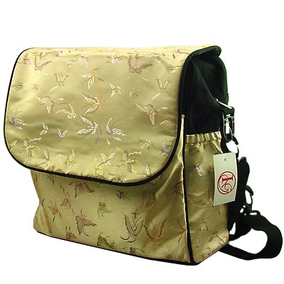 This diaper bag is covered with butterfly design Chinese brocade as outside fabric and uses heavy cotton for bottom and interior compartments. It's stylish and durable. It comes with a large wipeable padded change mat.