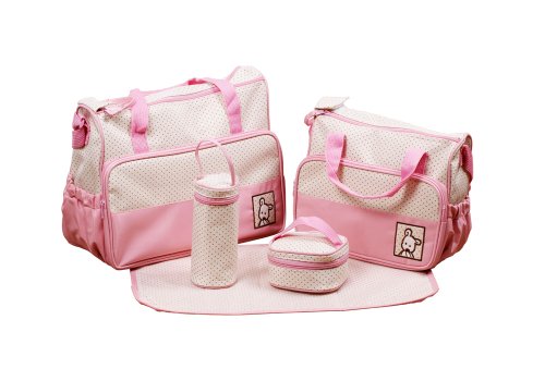 - Great set for Mommy's-To-Be! Comes in a 5 piece set: Large Diaper Bag, Small Diaper Bag, Bottle Holder, Changing Mat and Mess Bag.