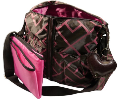 Tired of diaper bags that "look" like diaper bags? These functional bags have loads of pockets to store everything you need, yet look like a regular bag or purse. It is fashionably equipped with a stroller strap, allowing you to switch from stroller to shoulder. Also contains a changing mat, two insulated zipper bottle pockets, and five internal elasticized pockets for those itty-bitty things that usually get lost in the bottom of the bag. The interior includes a wipe clean lining-making clean-up of those stray cheerios a breeze. This diaper bag is sturdy, durable, and made to last. Includes one large outside pocket with snap; two outside bottle/sippy cup pockets; one insulated side zipper bottle pocket; five internal elasticized pockets; and one large internal zipped pocket. Wipe clean lining. Changing mat included. Dimensions: 13 inches high x 17 inches wide x 6 inches deep. Fuschia and brown criss cross design with pink interior.