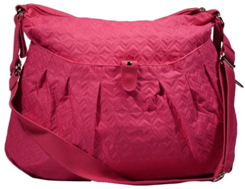 No one will know you're carrying a diaper bag with this stylish combination diaper bag/slouchy hobo. It is fashionably equipped with all the necessities needed for your baby. It contains a changing mat, one insulated zipper bottle pocket, one internal zipped pocket, and four internal elasticized pockets for those itty-bitty things that usually get lost in the bottom of the bag. The interior includes a wipe clean lining-making clean-up of those stray cheerios a breeze. This diaper bag is sturdy, durable, and made to last. Pink flush quilted outer design, tan interior.