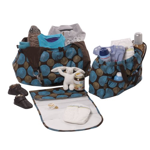 This is an incredibly spacious bag. It has really useful inside pockets in a removable organizer and two side zipper pockets. The removable organizer even has an insulated bottle compartment that zips closed, as well as a "wet" pocket that also zips closed and keeps wet items away from the rest of the bag. The bag sits up when you put it down really well -- mostly because the bottom of the bag is a zipper compartment that holds a matching portable changing pad (the folded changing pad adds some structure to the bag when it's zipped in). It also comes with stroller straps that allow you to attach the bag to any stroller. And my favorite feature... this bag converts from a shoulder bag to a messenger bag.