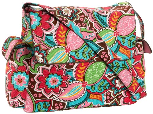 Had so much trouble finding a diaper bag that was FUN and functional this time around. I thought this was it! I didn't want to spend this much, but for the perfect bag, I would. I ended up sending it back because the side pockets fit only TALL thin bottles but NOT playtex sippy cups or short avent type bottles. Well, they fit in, like a glove, but were hard to fish out of the pocket. You can pull it out if you use two hands, but when does a mom ever have two hands free to fish a sippy cup out of a pocket? The base of the bag is also wider than the top opening, so I anticipated frustration while trying to find anything in the depths of that bag. It is very well made (sturdy fabric, rugged stitching) from what I could tell, but it is also pretty heavy on the shoulder. If Petunia Pickle Bottom had a bright and cheery print like this, I would buy their messenger bag again in a heartbeat.
