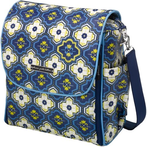 - Cerulean, midnight blue, chartreuse and eggshell mosaic-inspired medallion design, with cerulean and chartreuse hand-embroidered detail. Cerulean water-resistant lining and midnight blue straps.