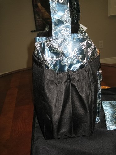 Inspired by the rich beauty of exquisite oriental brocades of the past, the Voyager creates an incredible fusion of fashion and function with bright, color-coordinated outer patterns and lining. This bag is very stylish and unique bag includes the following: Changing pad for baby with waterproof lining, Shoulder strap with adjustable length, Water and stain resistant lining for easy cleaning (100% poly), Spot Clean Brocard (100% rayon), Inside detachable brocade zippered pouch on a cord, 5 inside pockets, Zippered back compartment with room to store additional items, Side bottle pockets for easy access, Lightweight, Pedestal feet. The size of the bag is 14.25" W x 12 H x 5.5 D" made out of silk/ rayon on the outside and laminated nylon on the inside. This is Steel Blue with Black MicroFiber Body. The lining is Burnt orange lining.